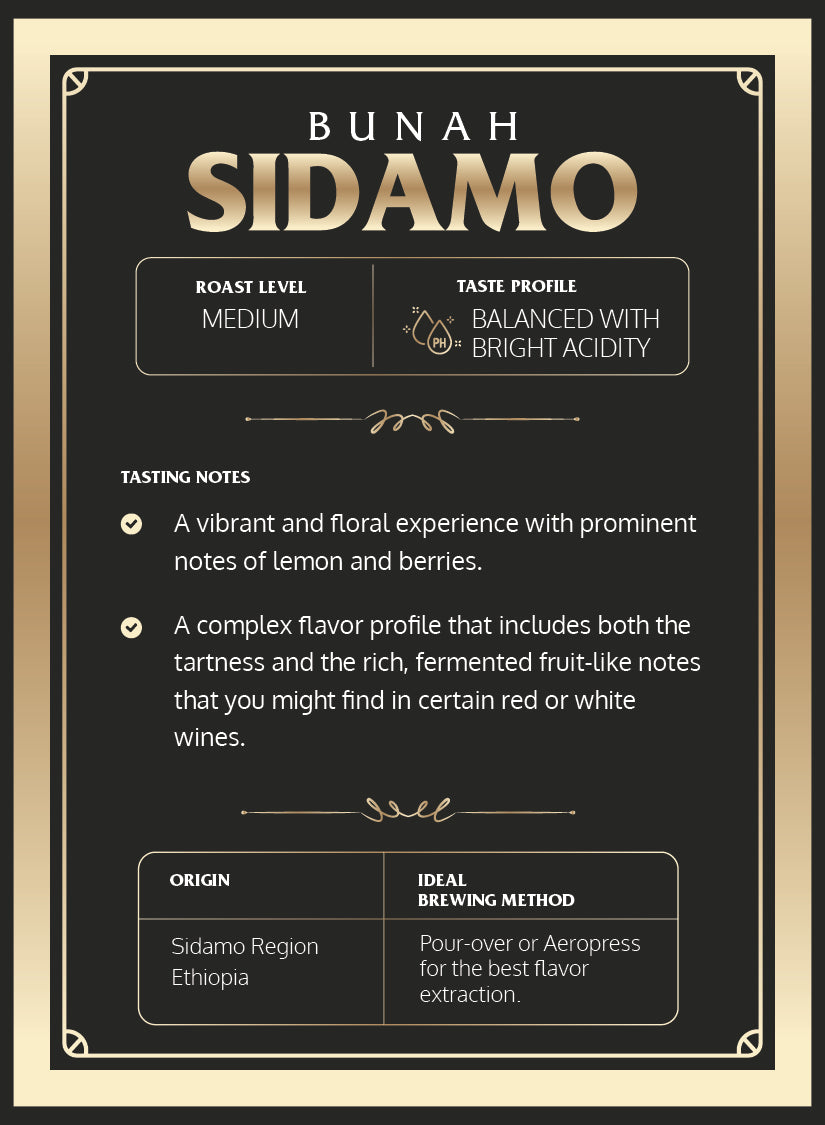 Sidamo offers an exquisite profile that captivates from the first sip. Experience the complexity of its flavors where notes of ripe berries meet subtle hints of citrus. The wine-like undertones harmonize these fruity notes, culminating in a smooth, clean finish that resonates with both novice enthusiasts and seasoned connoisseurs alike. For Bunah Sidamo, the mention of a wine-like undertones indicates that this coffee likely exhibits these vibrant, fruity flavors combined with a clear, bright acidity, making it both refreshing and complex. This profile is complemented by the floral, lemon, and berry notes, creating a layered and sophisticated tasting experience, akin to enjoying a fine wine. This characteristic makes Bunah Sidamo particularly appealing to those who appreciate intricate and dynamic flavors in their coffee.